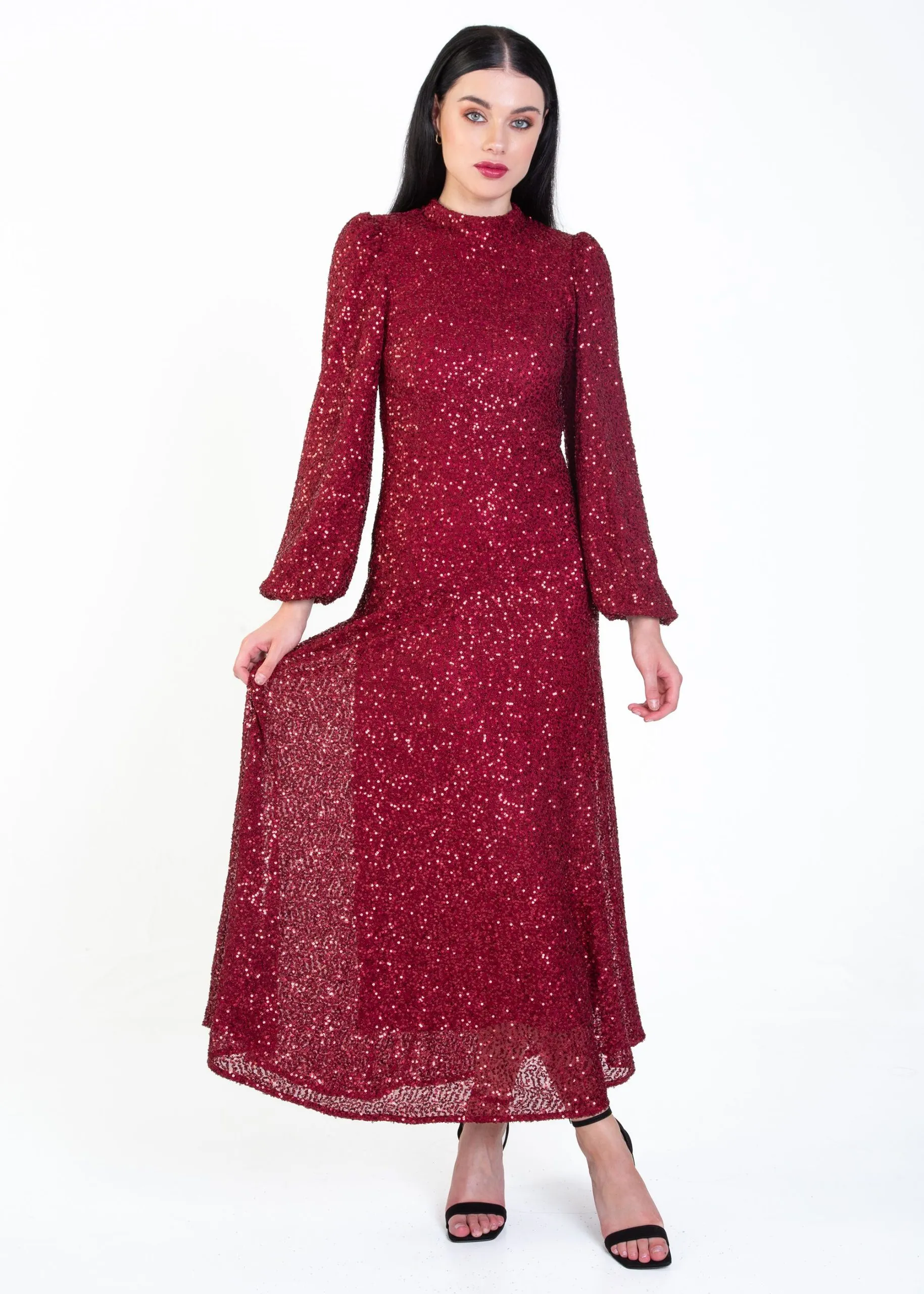 Sale!Burgundy Sequin High Neck Occassion Midi Dress