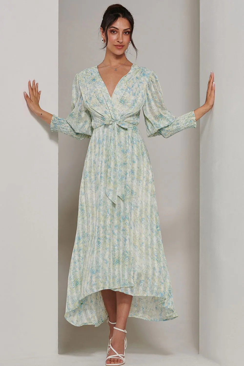 Sale!V Neck Tie Waist Puff Sleeve Maxi Dress