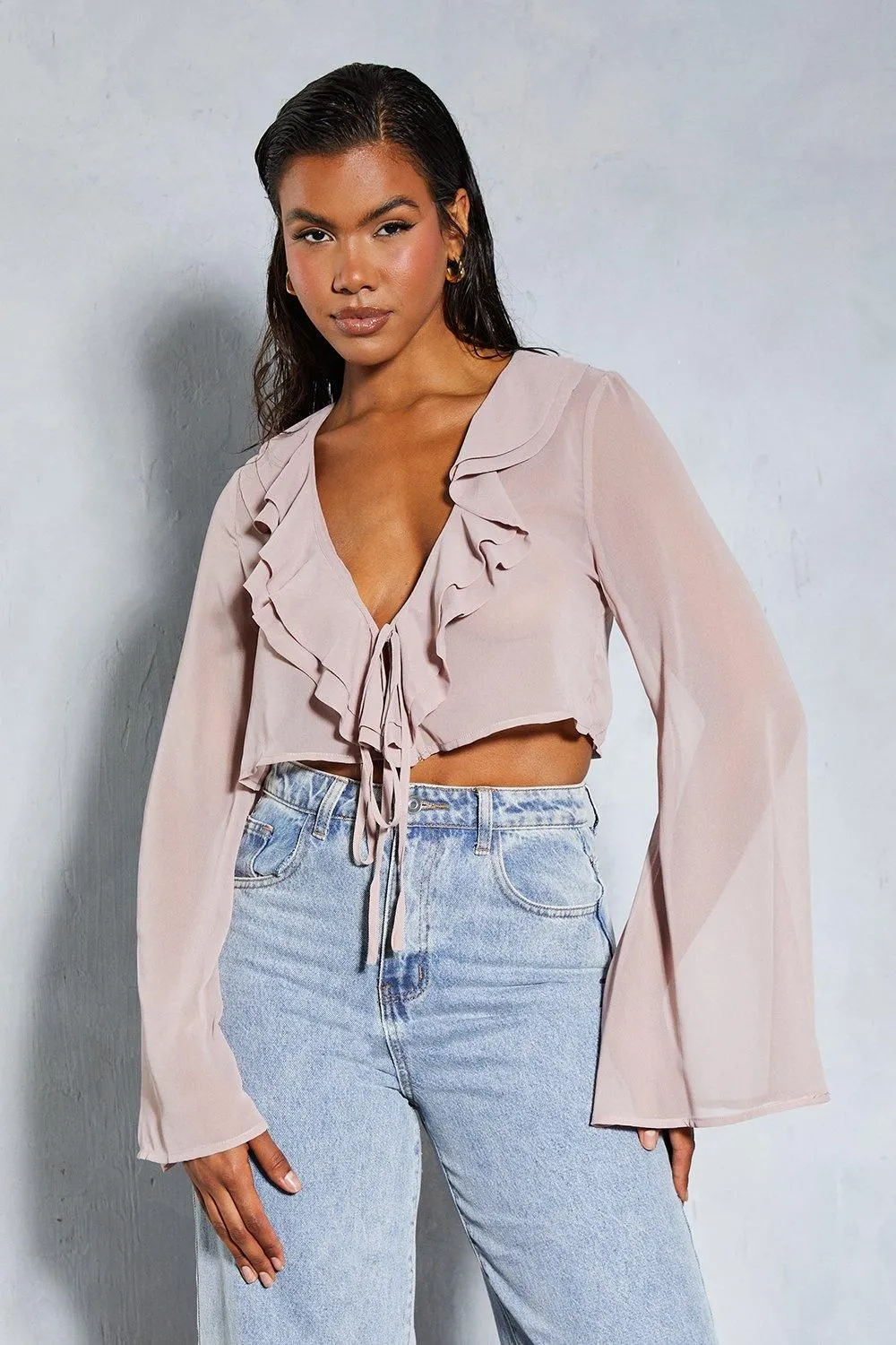 • Chiffon Frill Layered Flute Sleeve Cropped Blouse