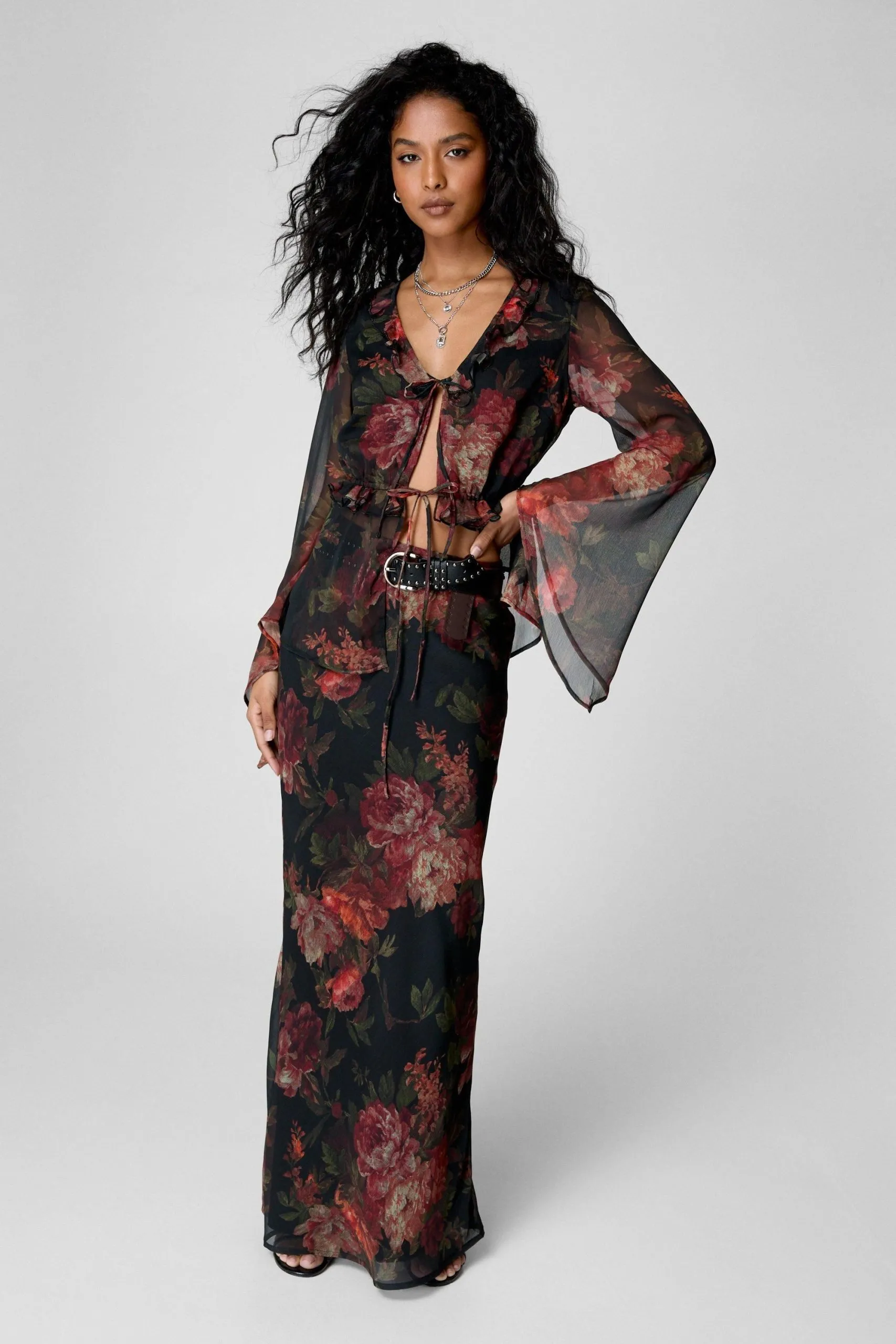 • Velvet Floral Embroidered Ruffle Wrap Top
