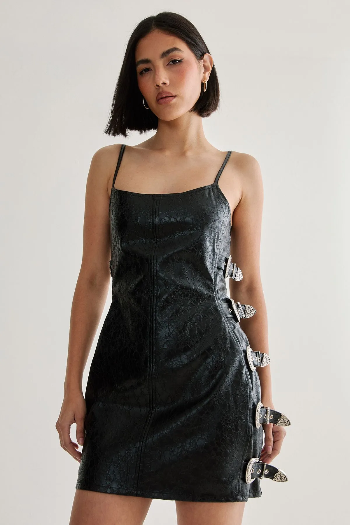 Sale!Distressed Faux Leather Buckle Detail Dress