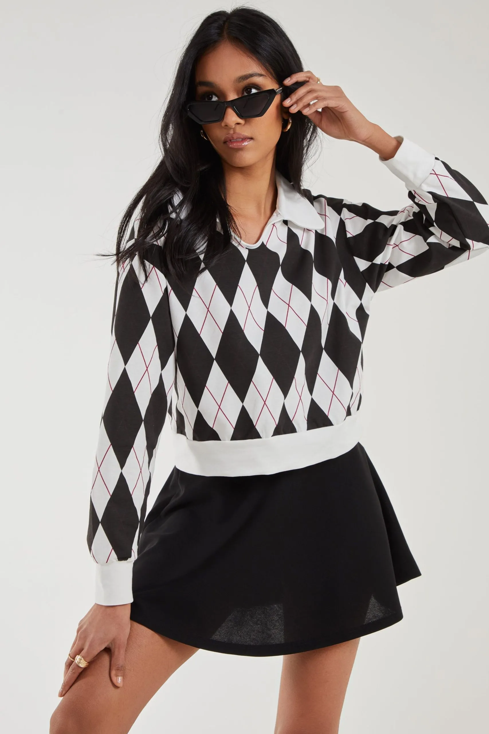 Sale!Black Long Sleeve Collared Diamond Top