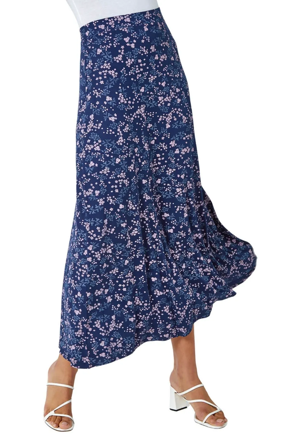 Roman Navy Floral Print Elastic Waist Midi Stretch Skirt