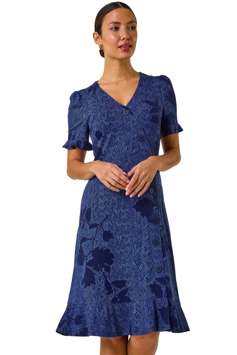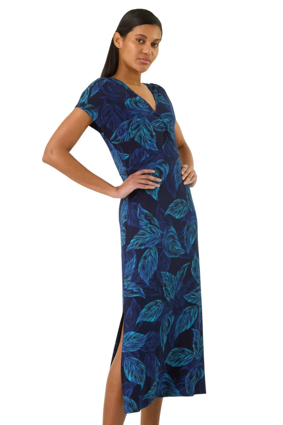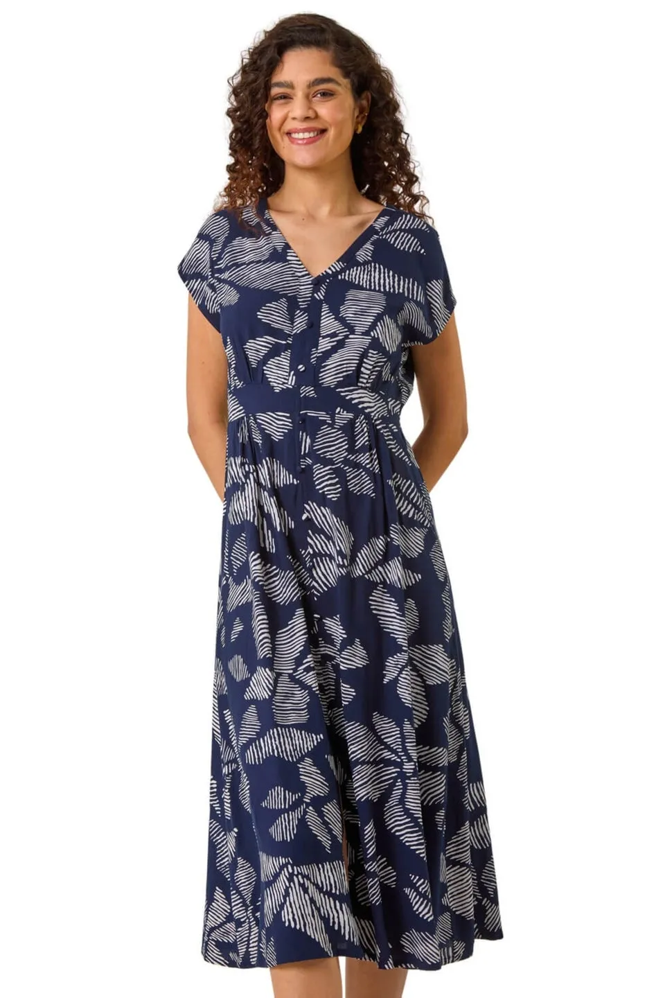 • Roman Navy Leaf Print Buttoned Midi Dress