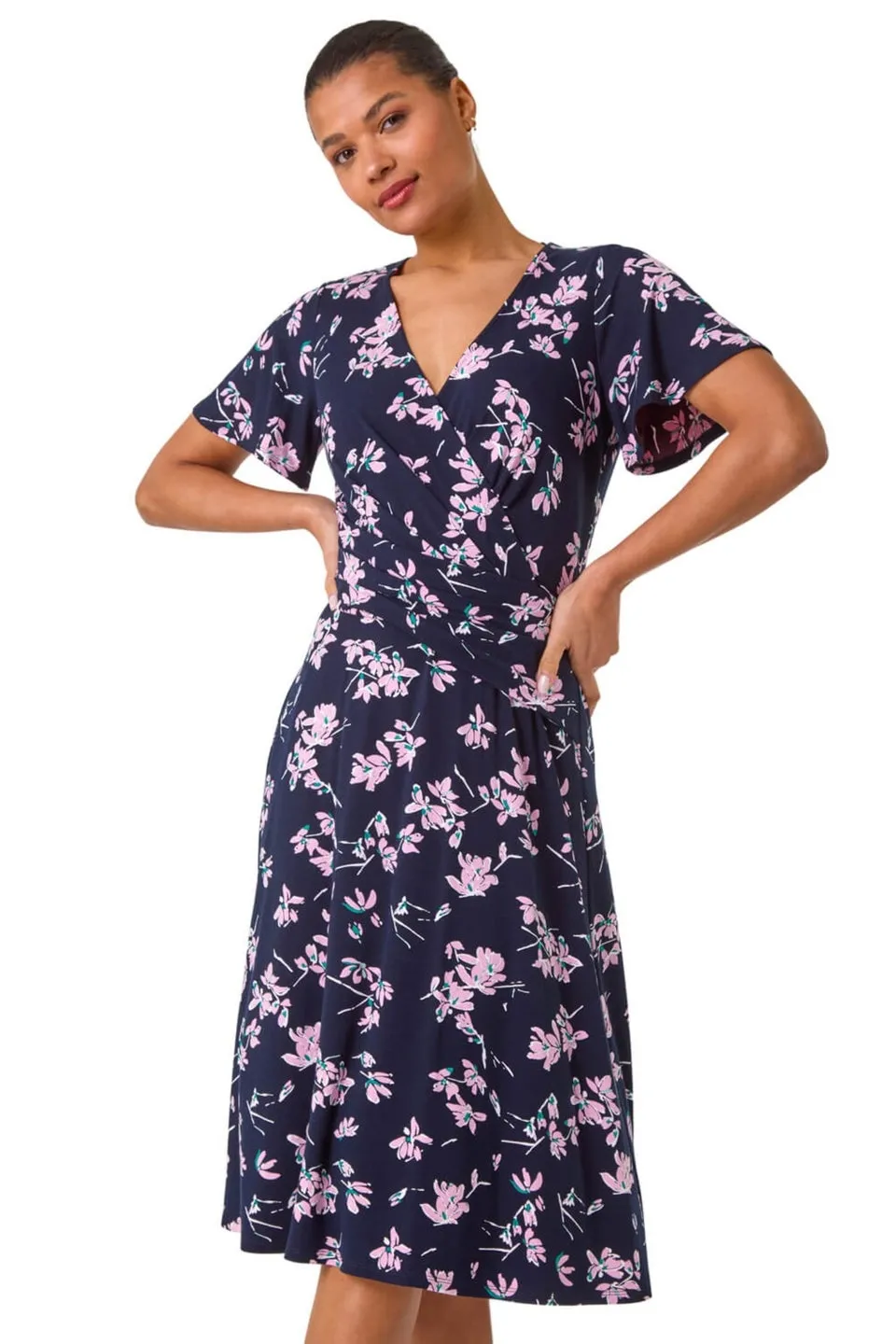 • Roman Navy Floral Print Wrap Over Midi Dress