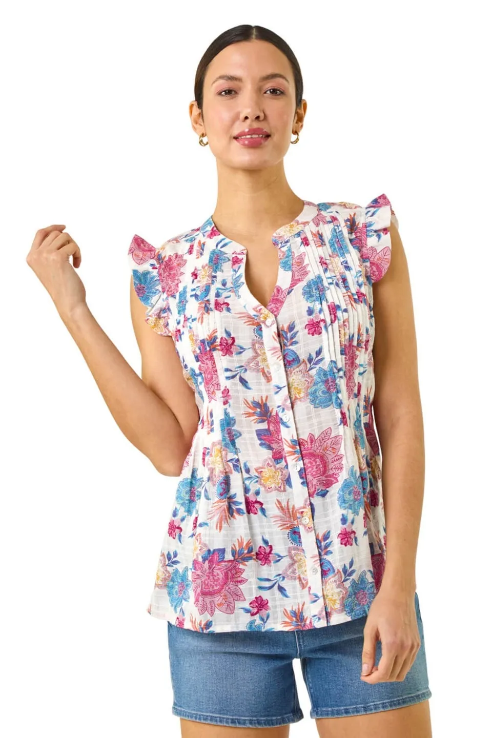 Sale!Roman Pink Floral Print Pintuck Frill Blouse