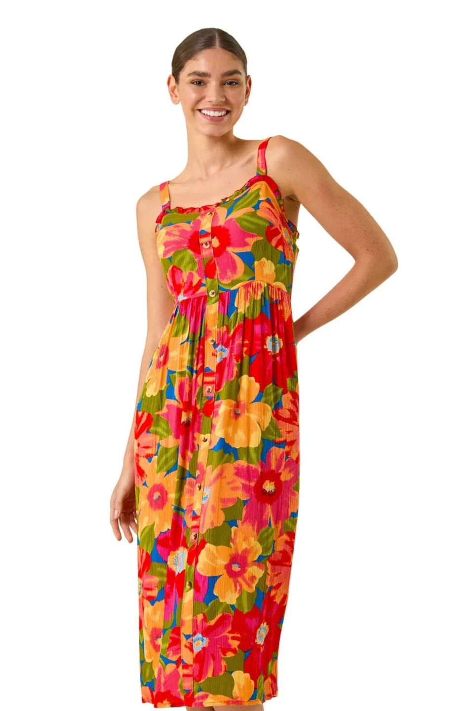 Sale!Roman Pink Floral Print Button Midi Sundress