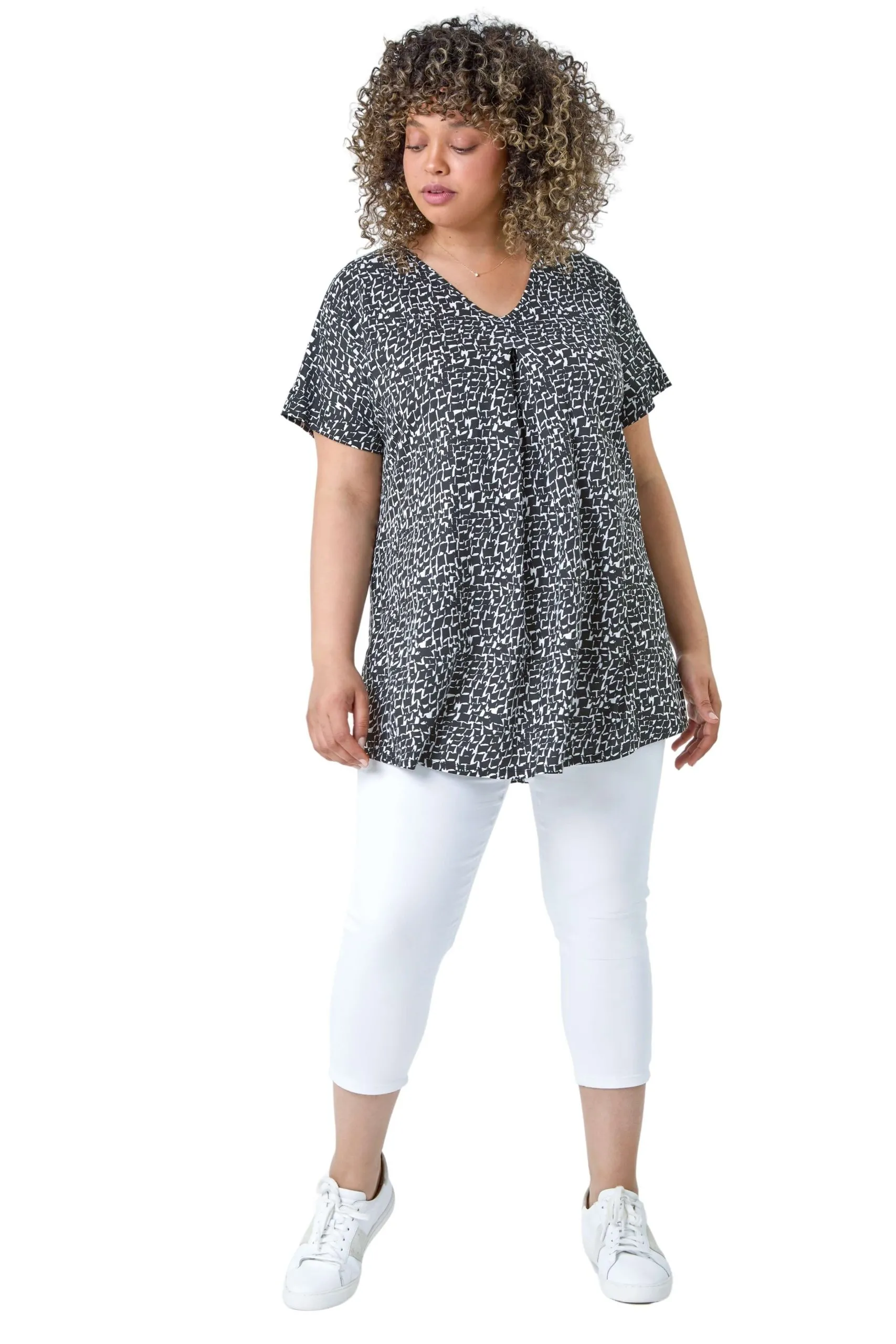 Sale!Curve Pleat Front Printed V-Neck Stretch Top