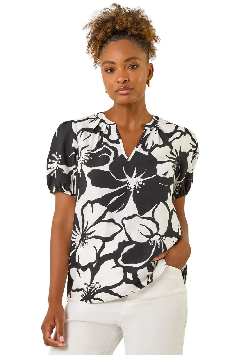 Floral Mono Print V-Neck Top