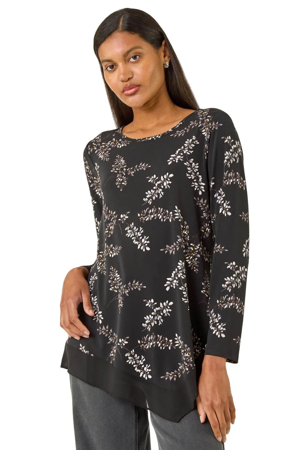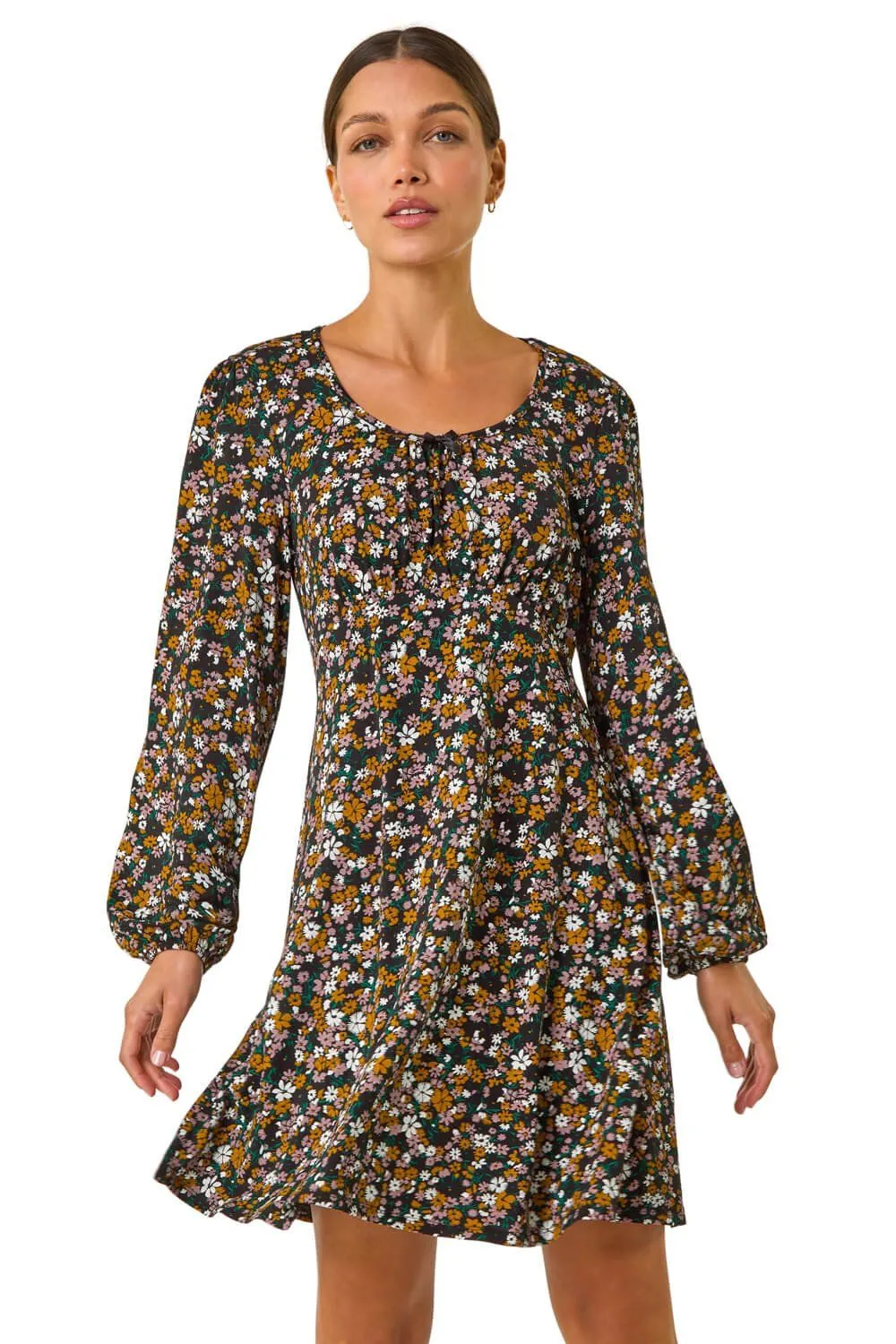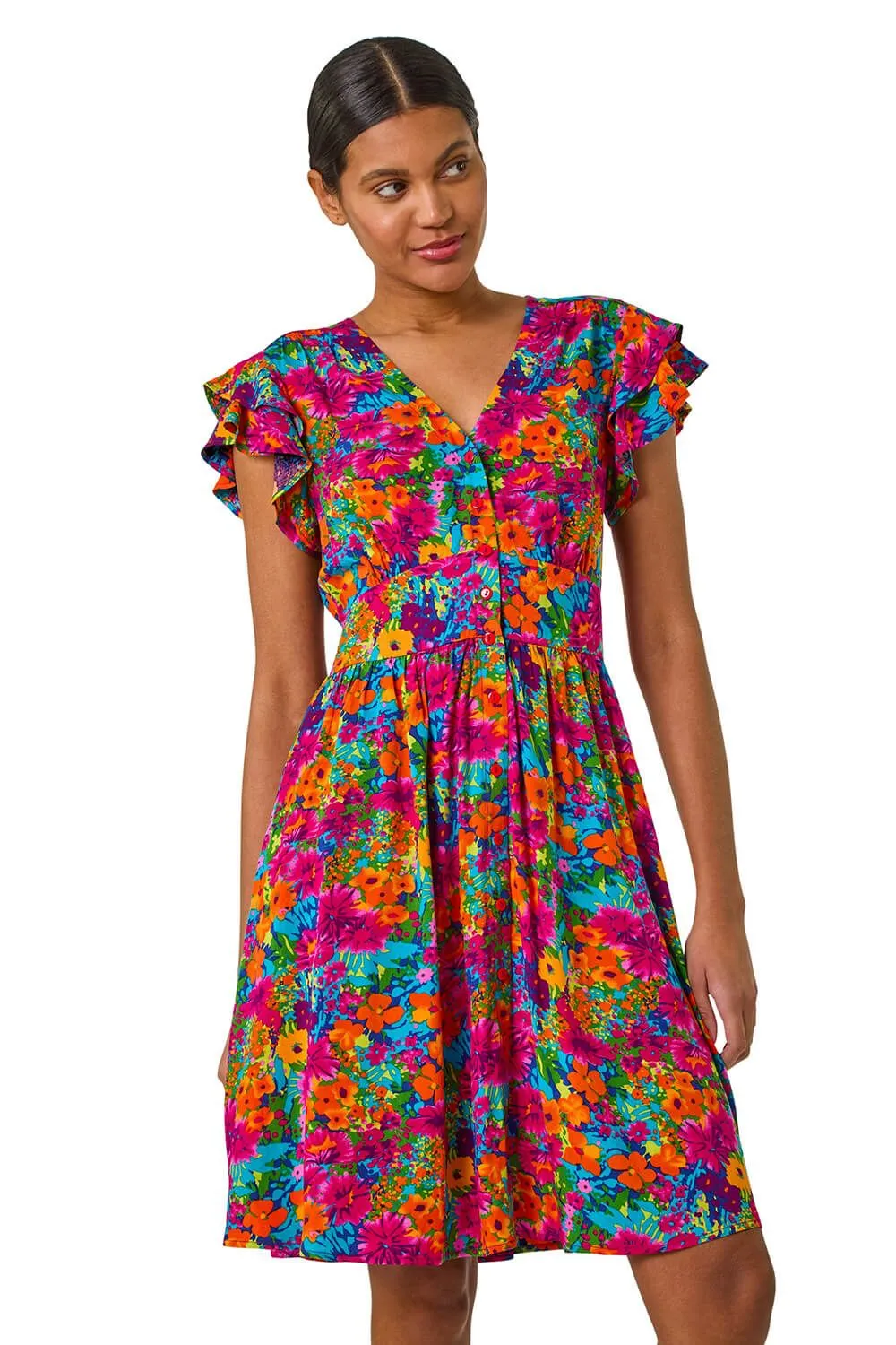 • Floral Print Chiffon Frill Wrap Midi Dress