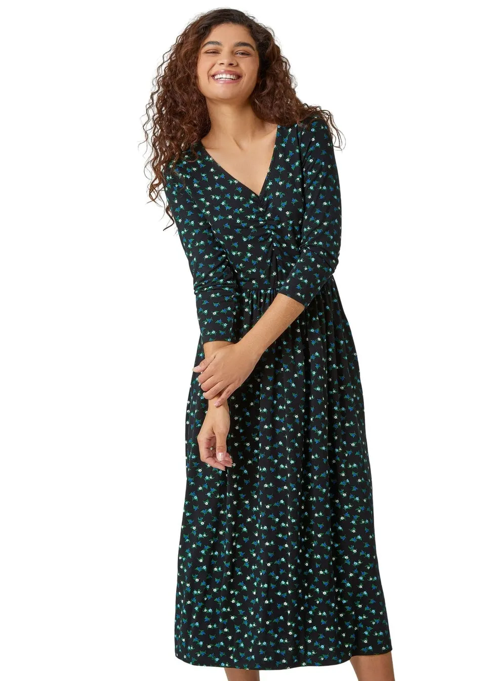 Sale!Roman Black Ditsy Print Pocket Midi Stretch Dress