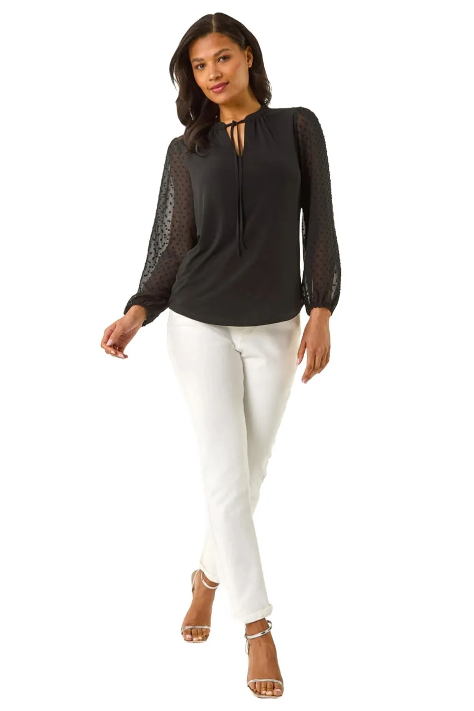 Sale!Roman Black Dobby Spot Tie Neck Mesh Top