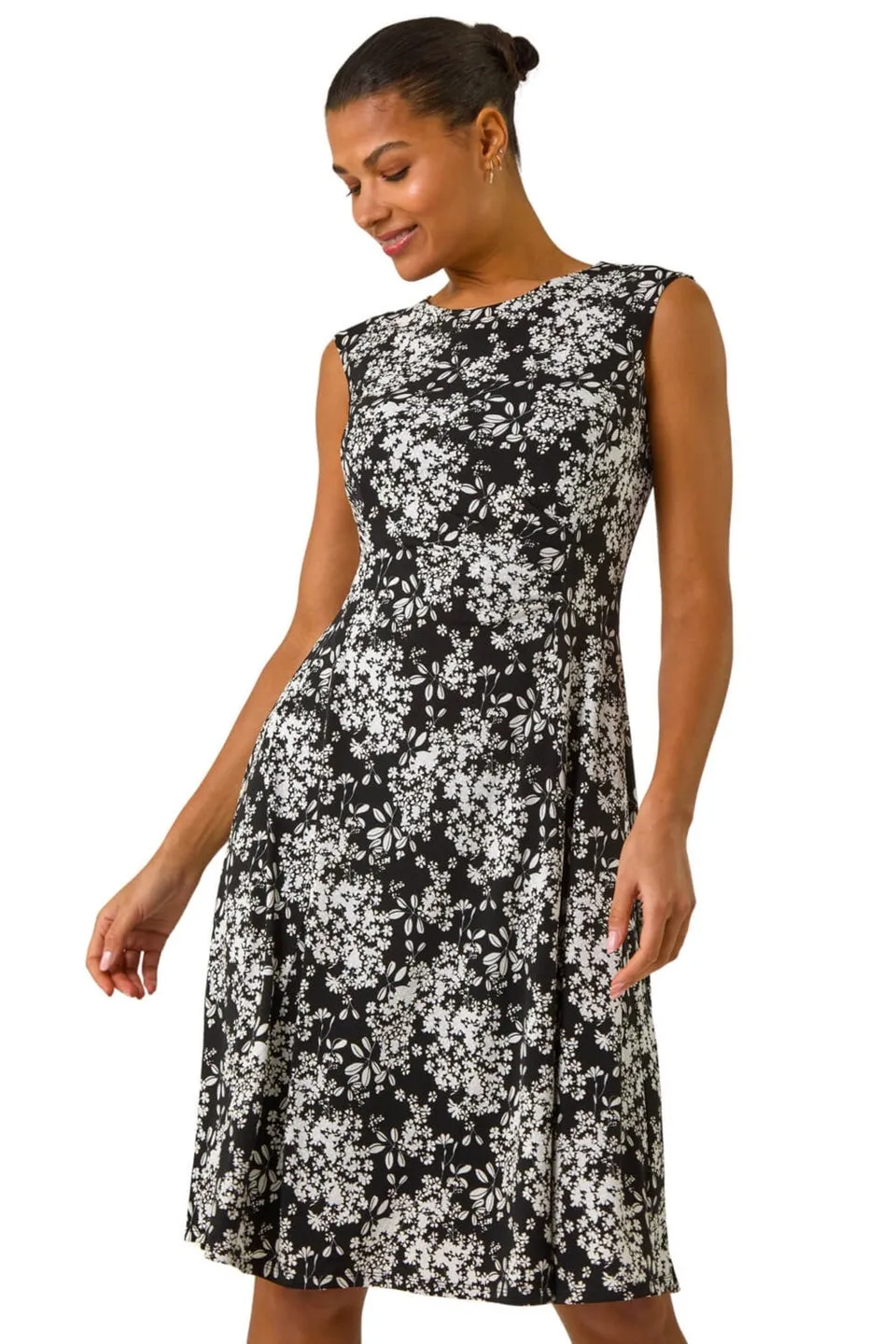 • Roman Black Floral Puff Print Gathered Stretch Midi Dress