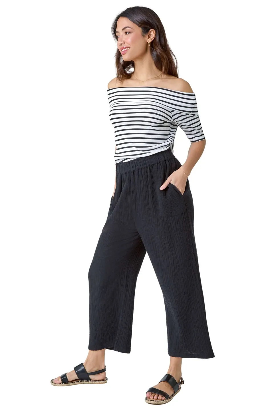 Roman Black Textured Cotton Elastic Waist Culotte Trousers