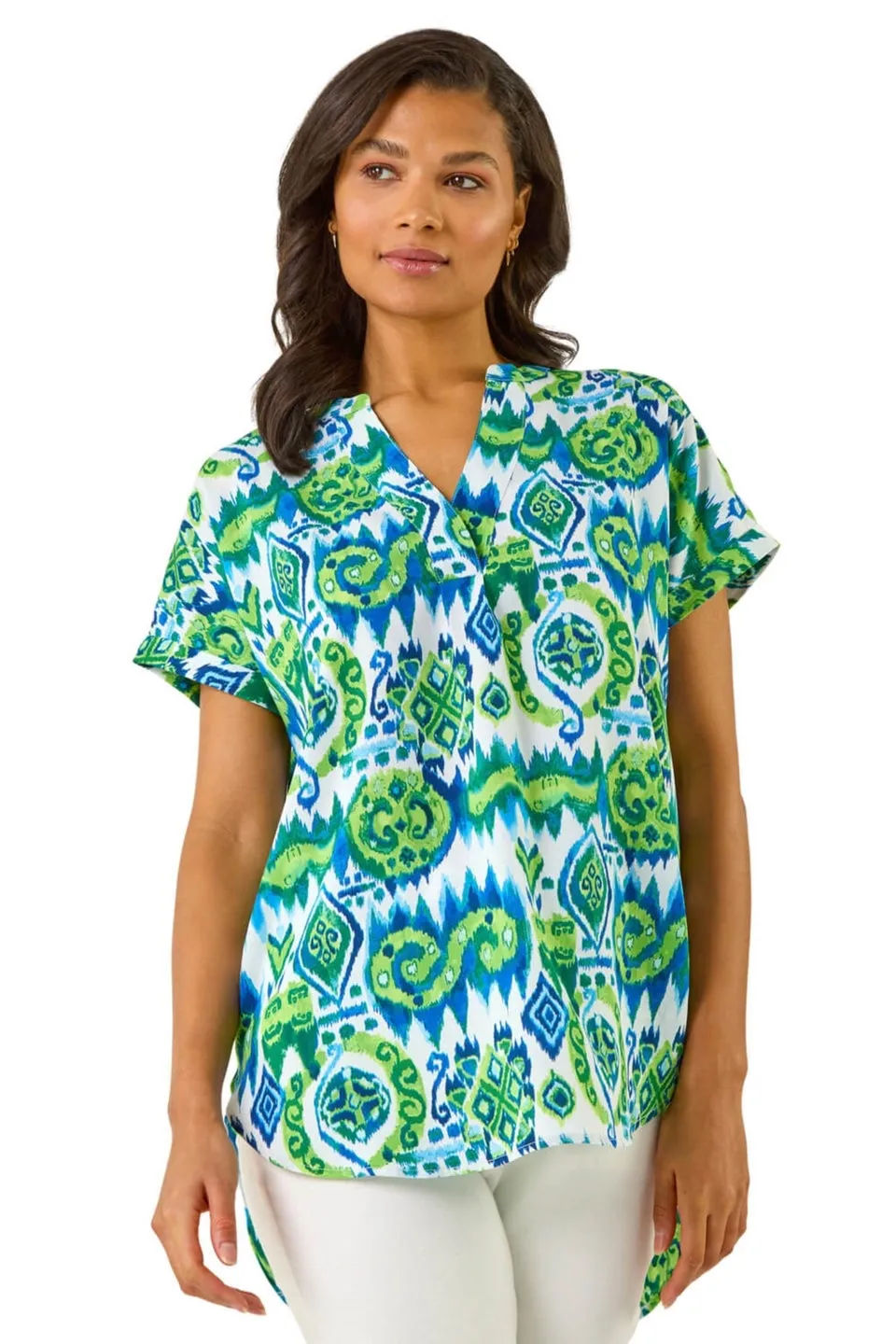 Sale!Roman Blue Aztec Print Short Sleeve Top