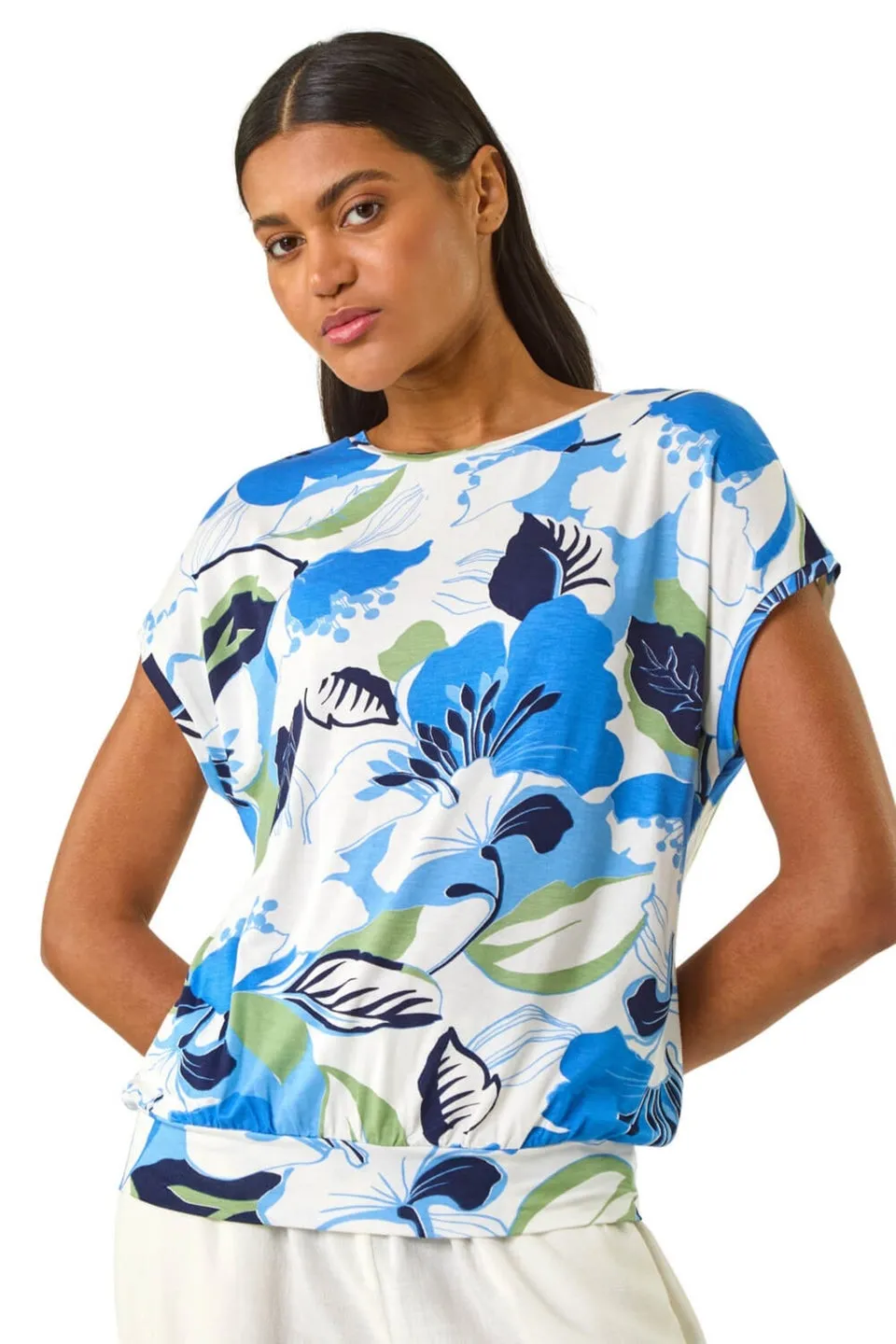 Sale!Roman Blue Floral Print Short Sleeve Top