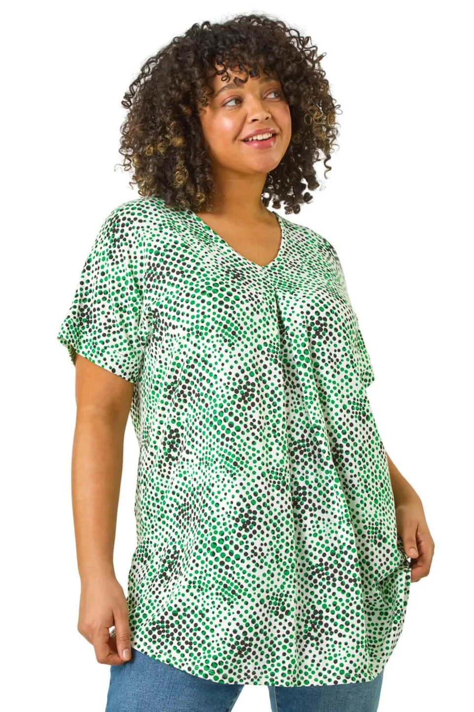 Sale!Roman Green Curve Spotted Leaf Print Stretch Top