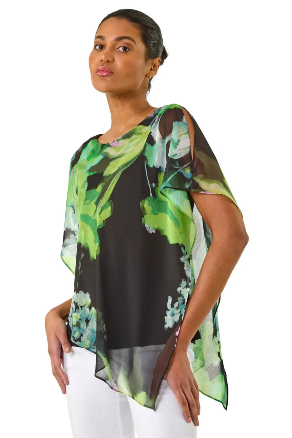 Sale!Roman Green Floral Print Asymmetric Overlay Top