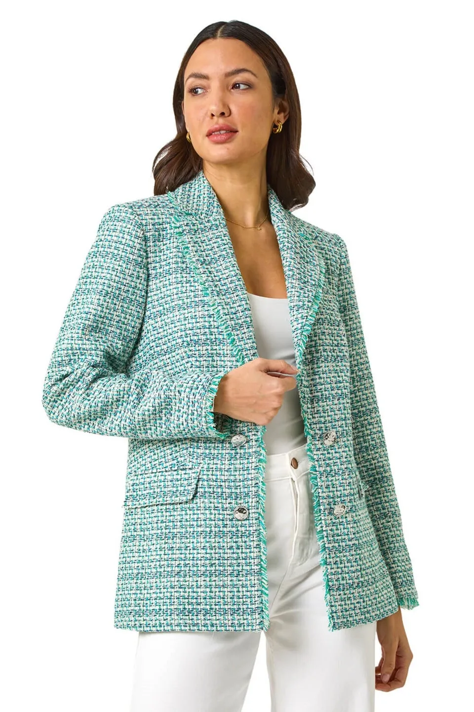 Sale!Roman Green Check Frayed Edge Boucle Button Jacket