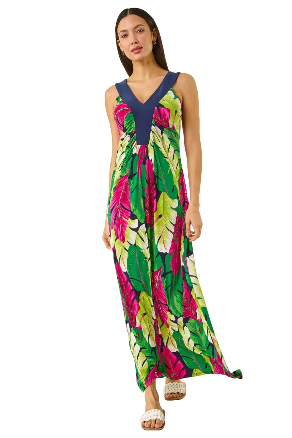 Roman Green Leaf Print Contrast Band Maxi Dress