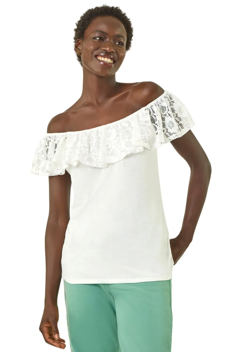 Roman Ivory Lace Trim Bardot Top