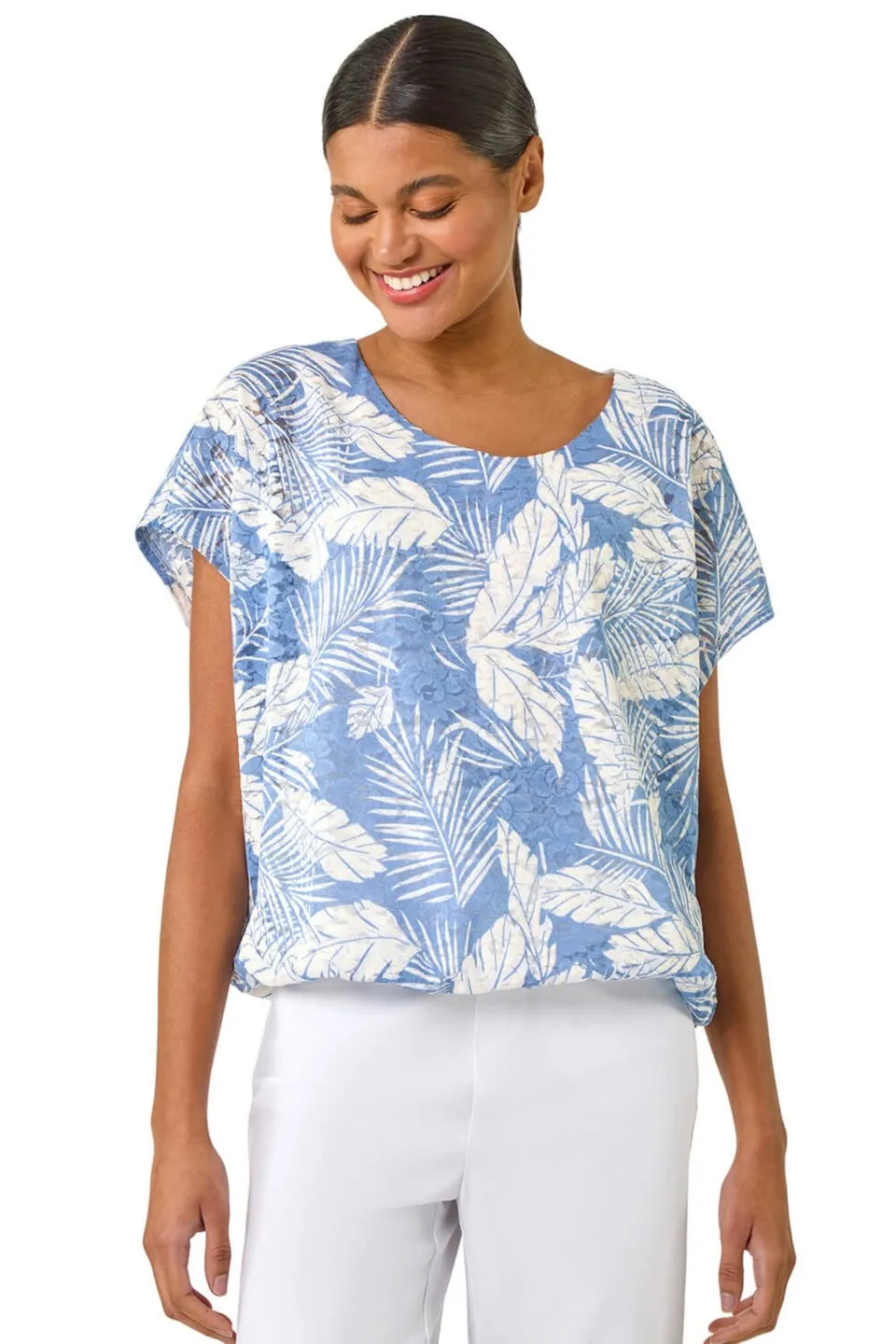 Roman Light Blue Leaf Print Lace Bubble Hem Top