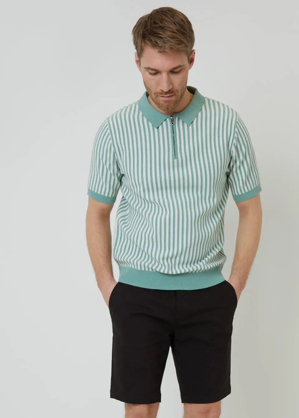 Sale!Threadbare Soft Green Textured Quarter Zip Striped Knitted Polo Shirt