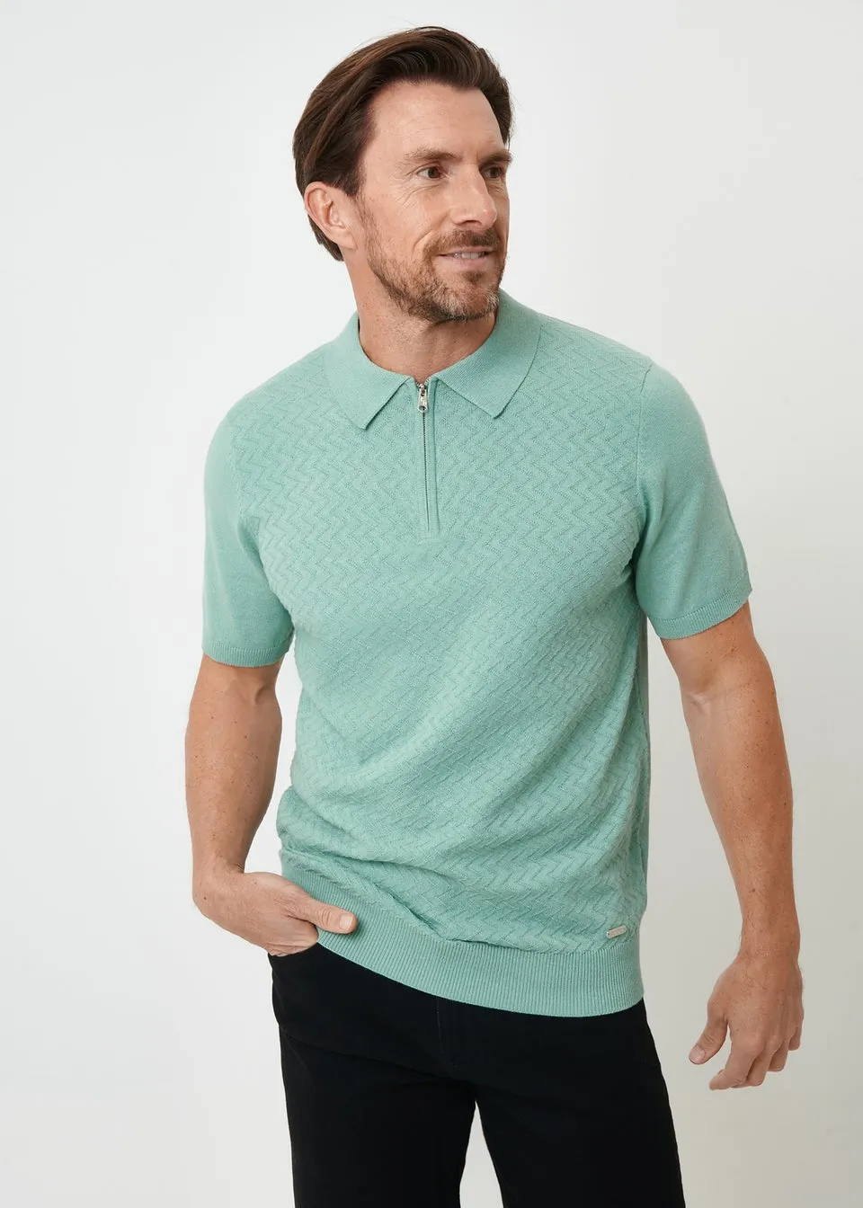 Sale!Threadbare Soft Green Textured Front Quarter Zip Knitted Polo