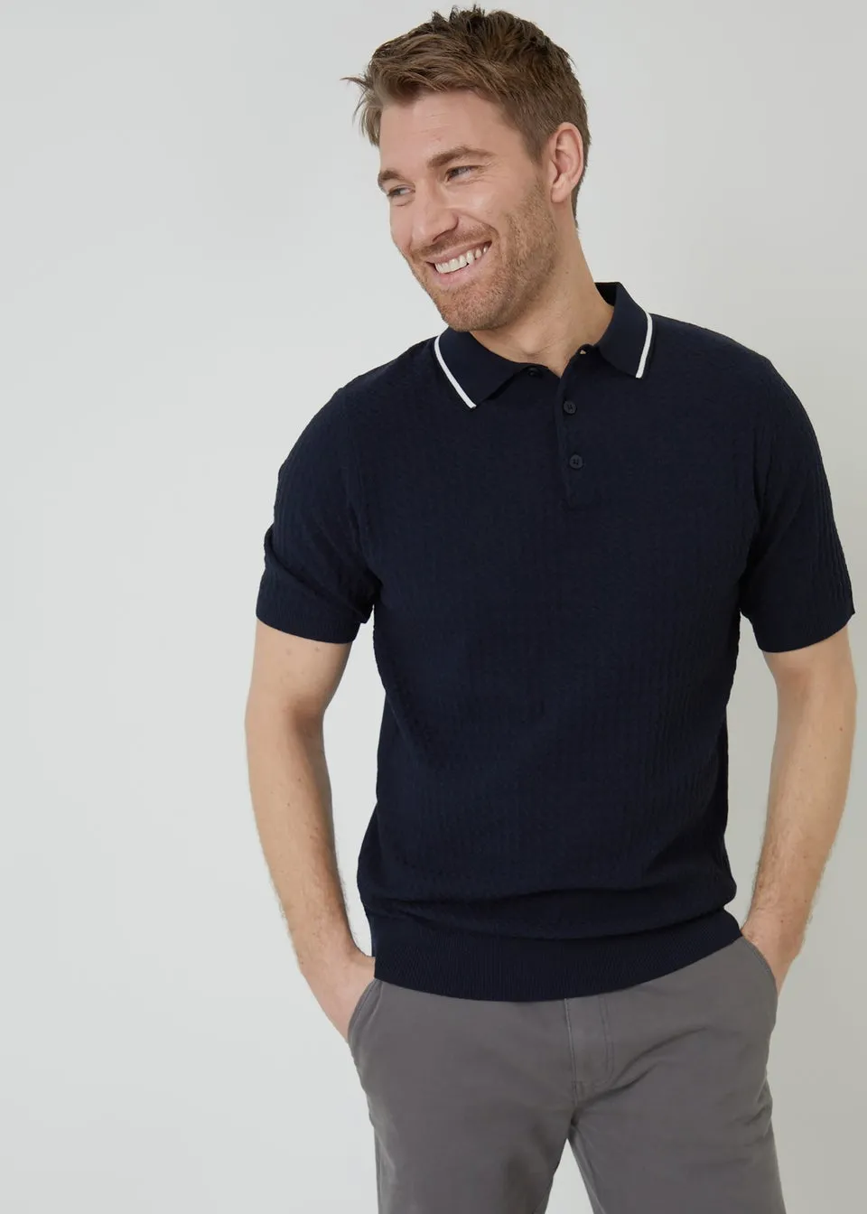 Sale!Threadbare Navy Textured Front Tipping Collar Knitted Polo Shirt