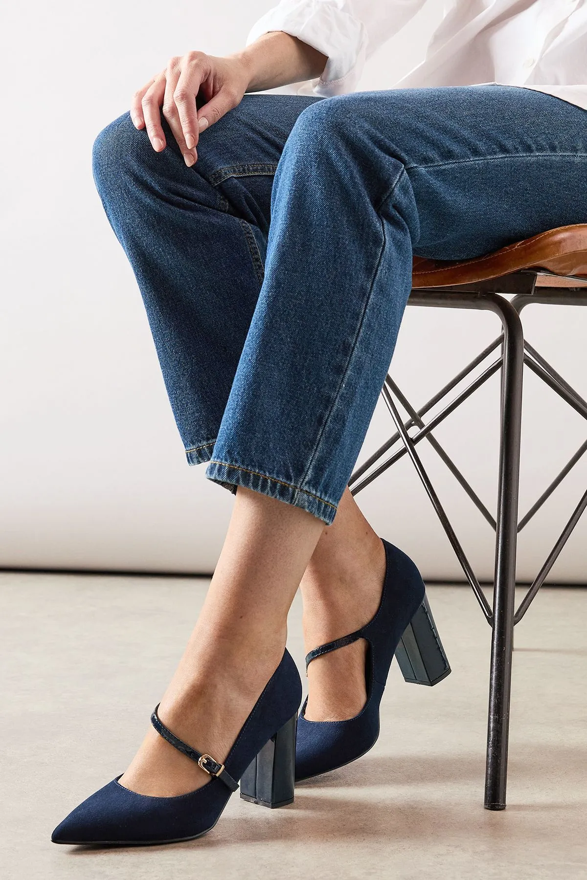 Sale!Elodie Faux Suede & Patent Asymmetric Strap Pointed High Block Heel Court Shoes