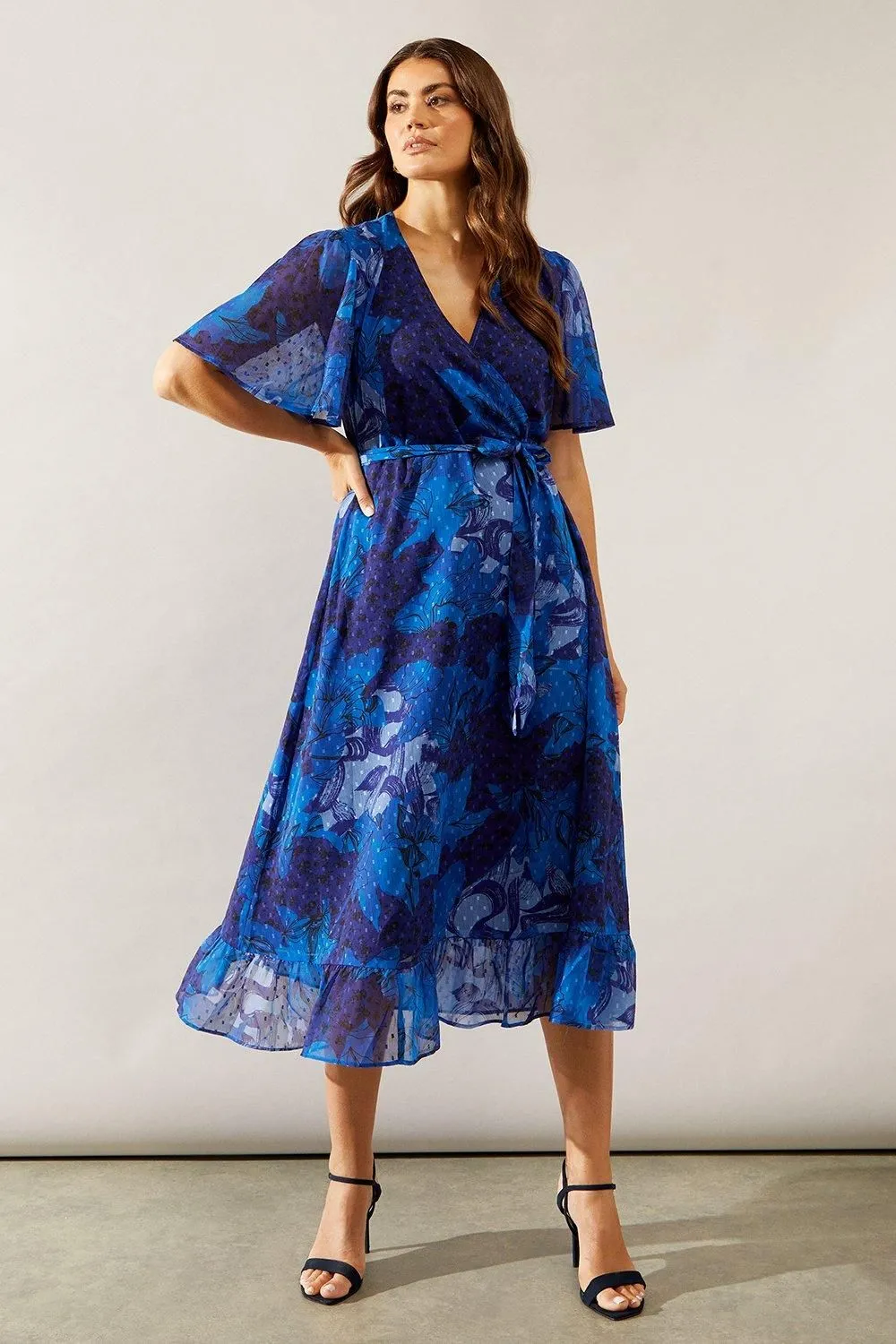 Sale!Floral Texture Wrap Flutter Sleeve Midi Dress