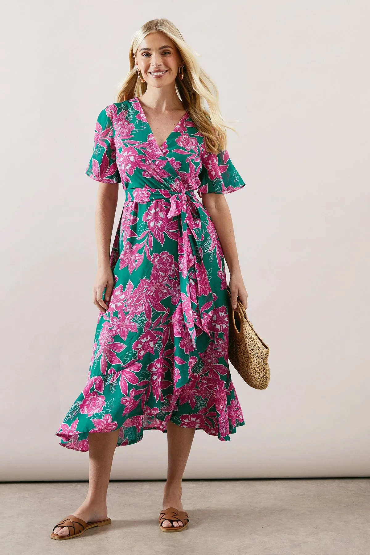 Petite Floral Ruffle Wrap Belted Midi Dress