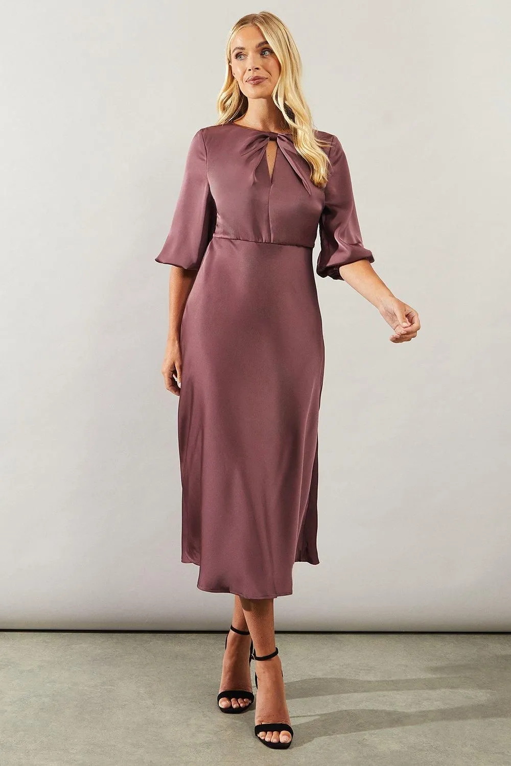 Sale!Petite Occasion Satin Knot Bias Midi Dress