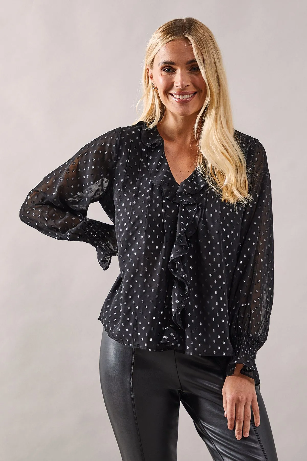 Sale!Petite Occasion Ruffle Front Metallic Blouse