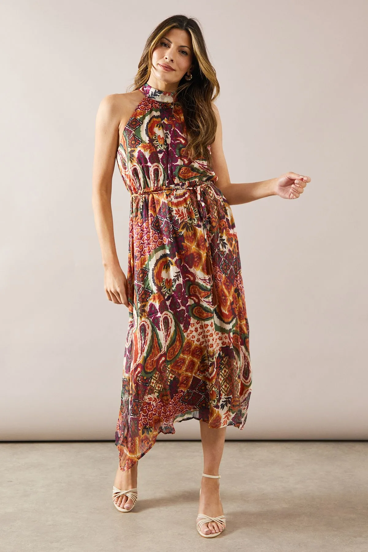 Chiffon Abstract Halterneck Tie Waist Midi Dress