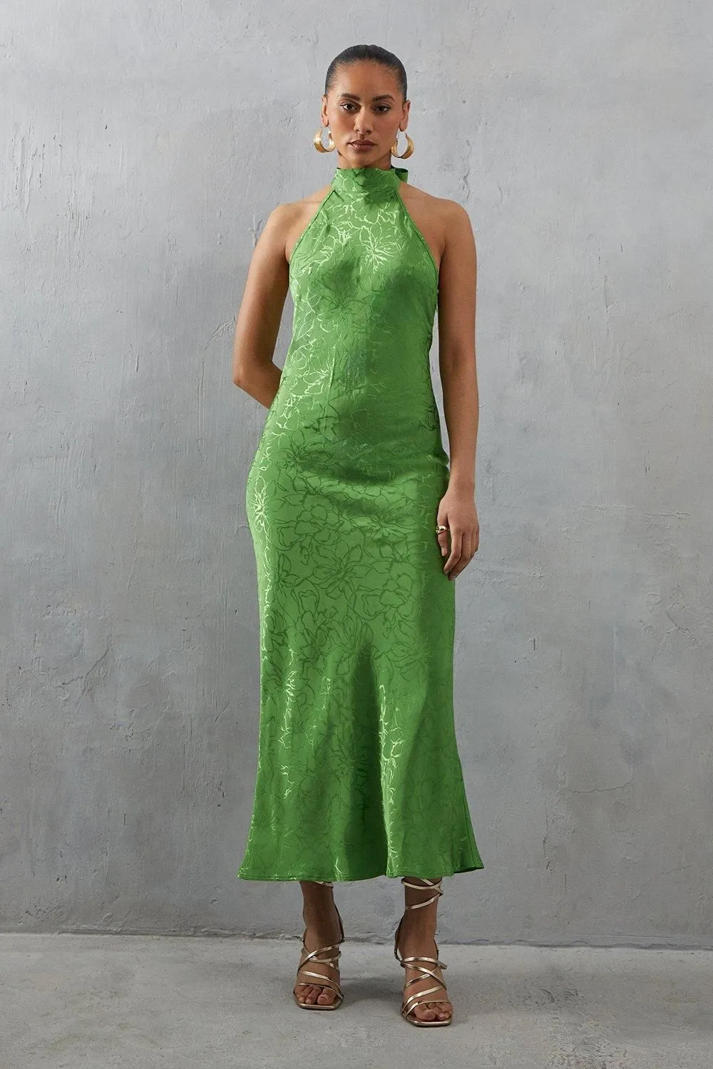 Sale!Satin Jacquard Halter Tie Neck Midi Dress