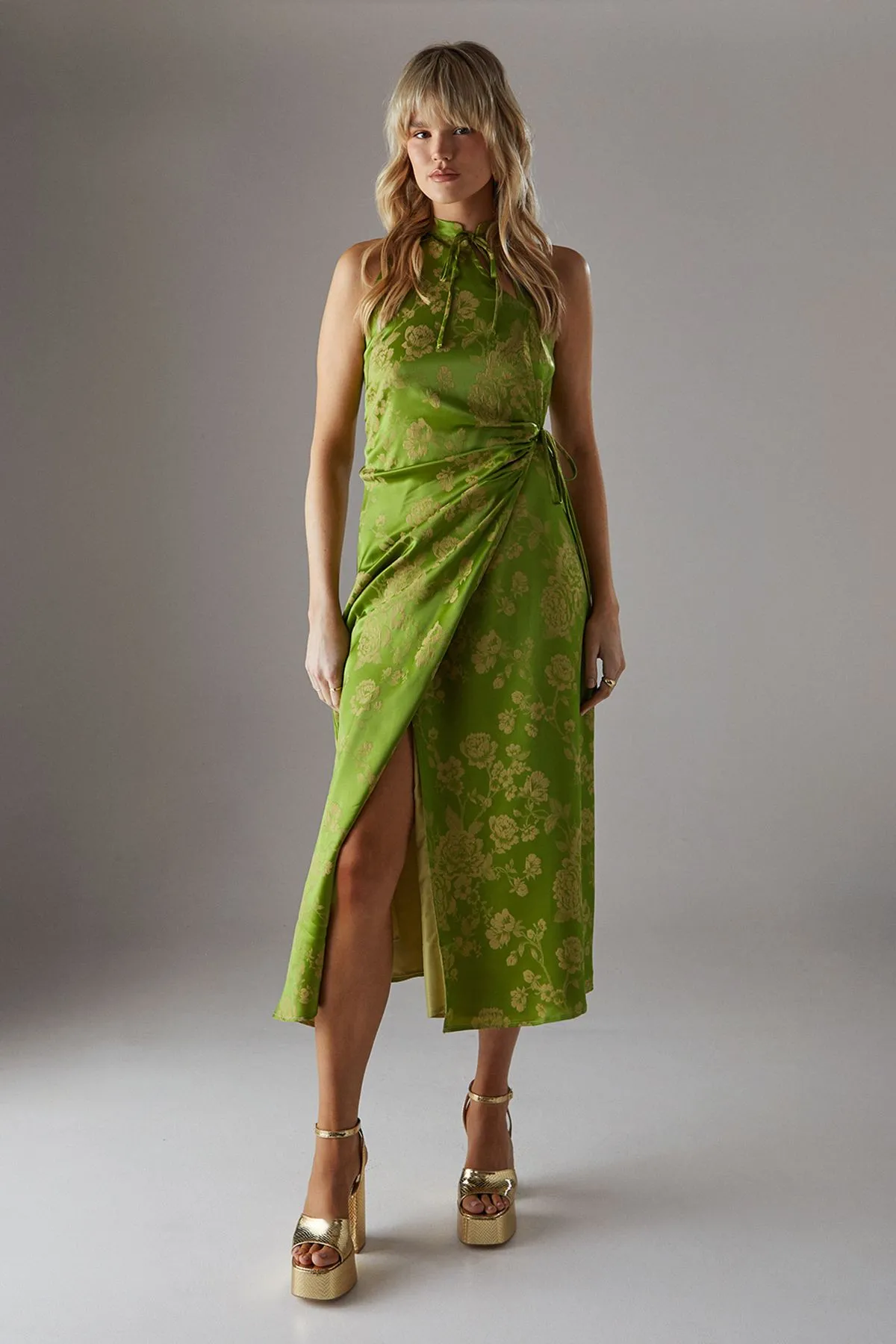Sale!Satin Jacquard Tie Racer Wrap Midi Dress