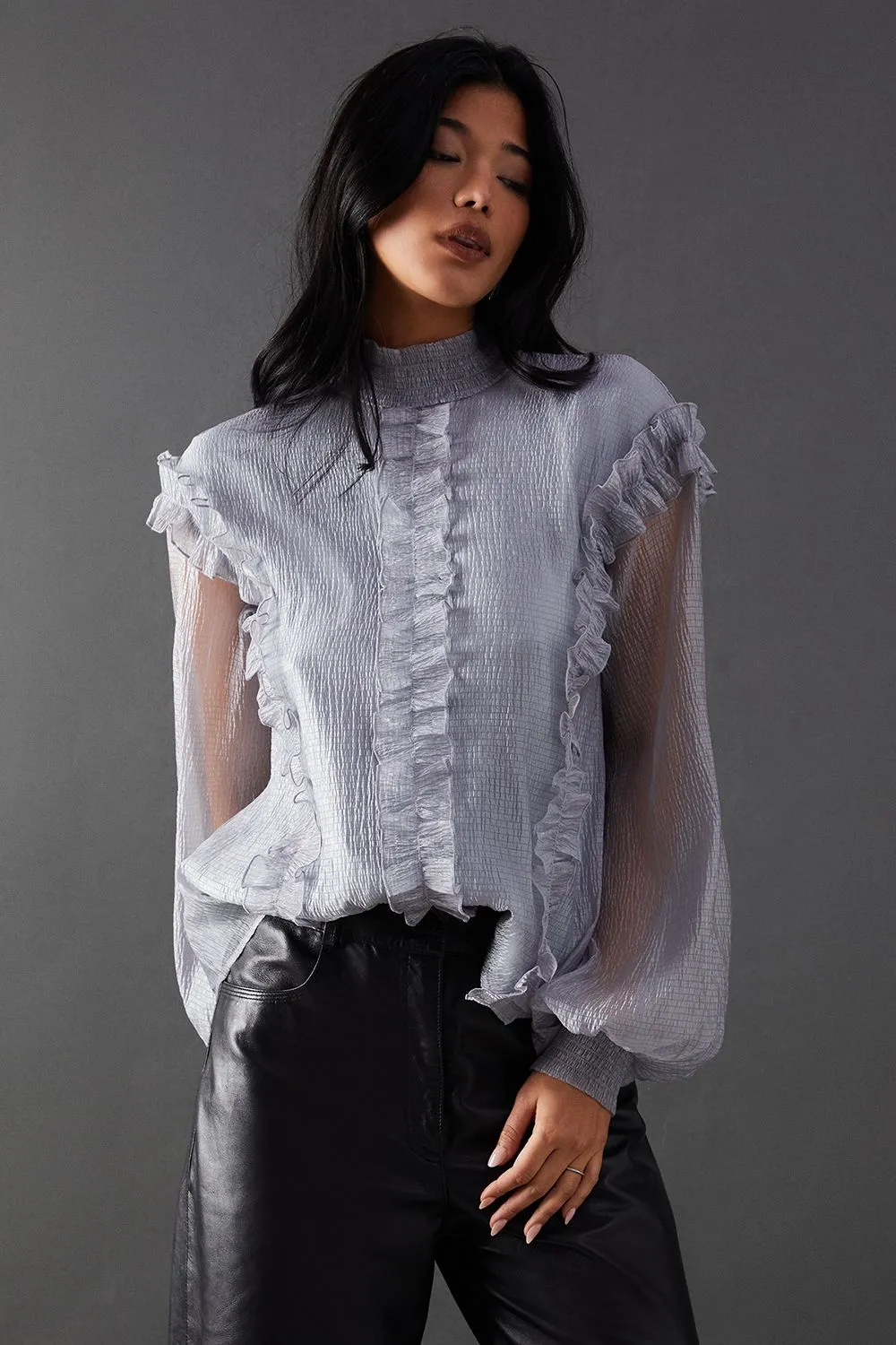 Sale!Shirred Chiffon Ruffle Detail High Neck Blouse