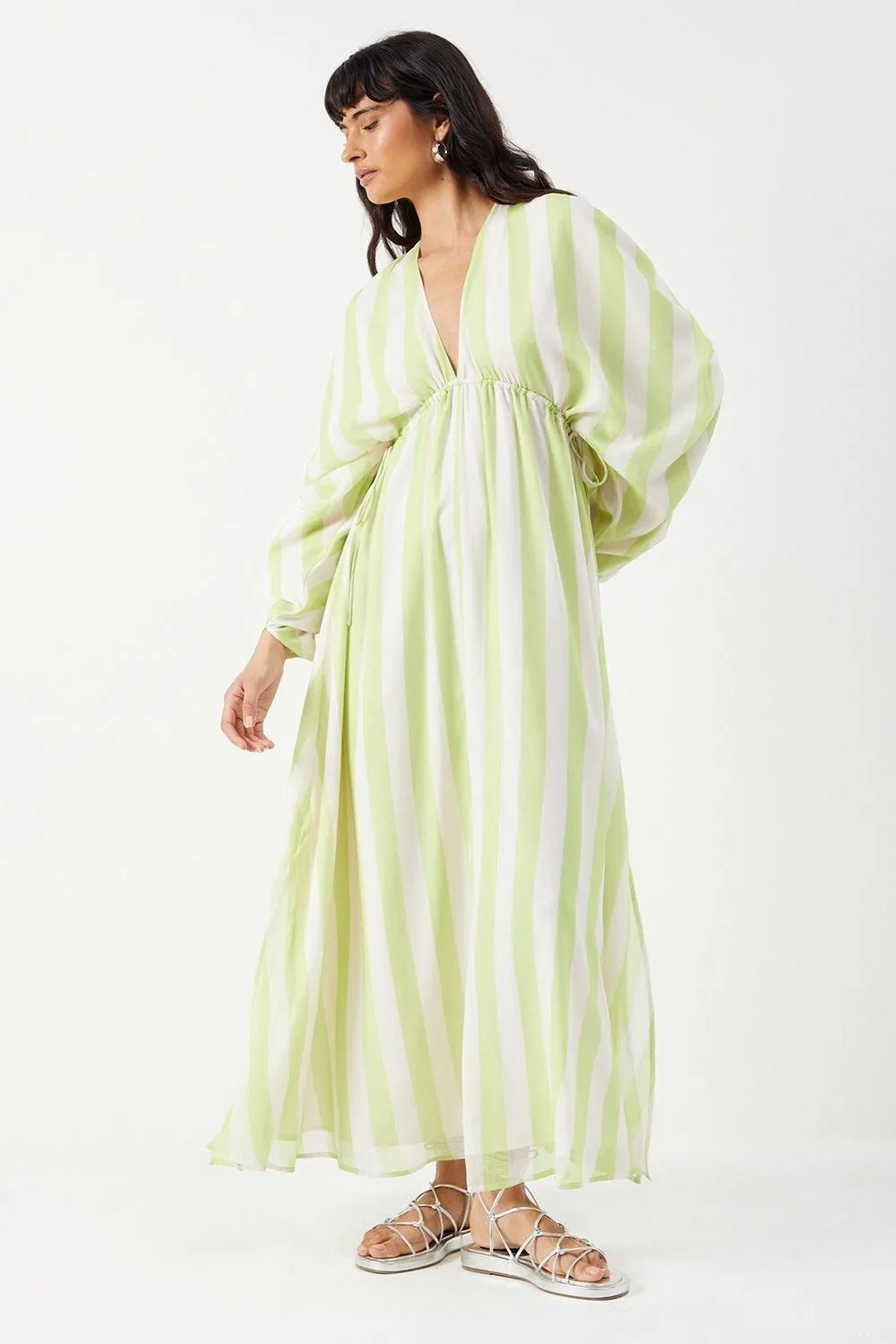 Stripe Chiffon Pleat Plunge Neck Batwing Midaxi Dress