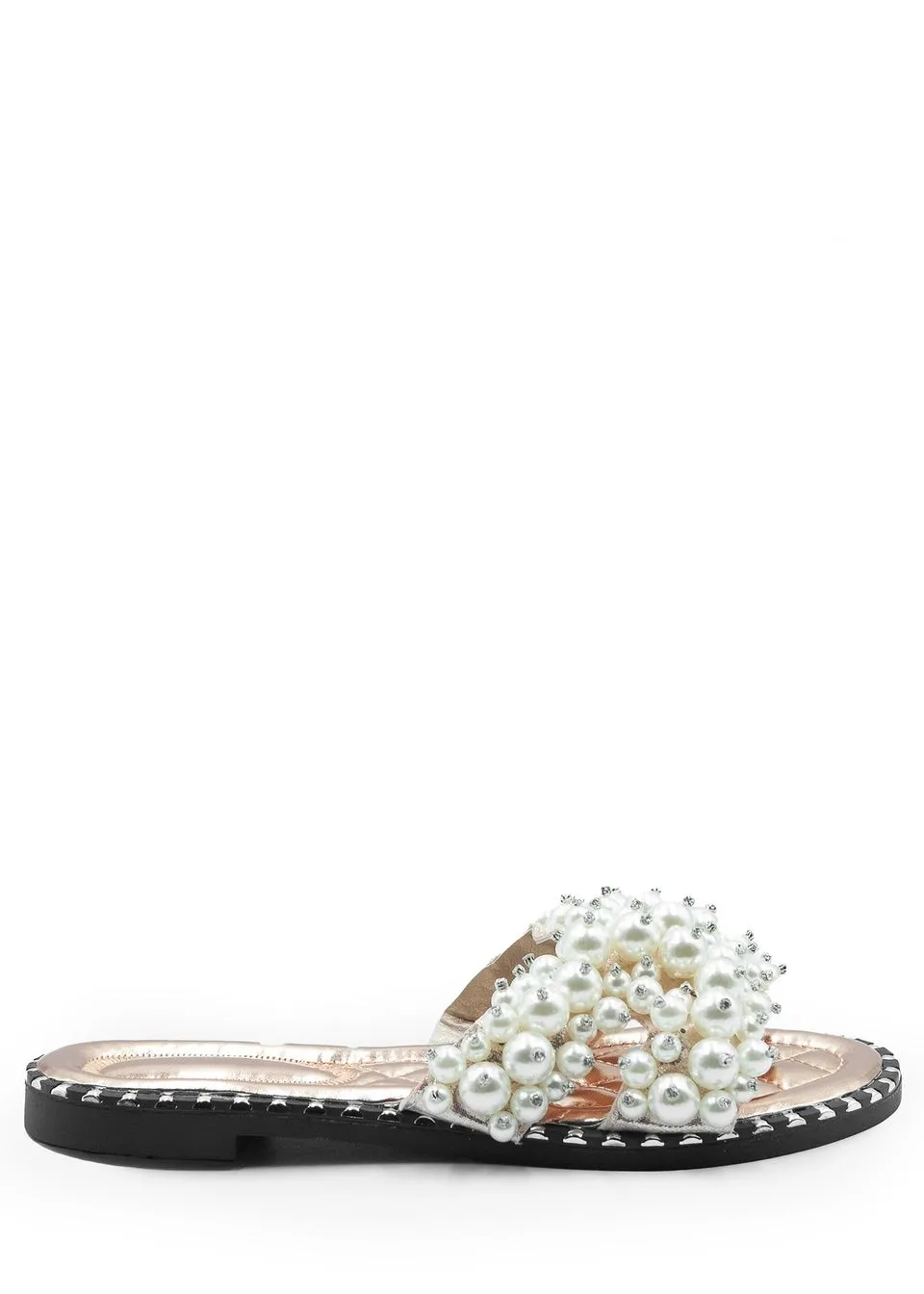 Sale!Where’s That From Silver Eve Pearl Embellished Flat Slider Sandals
